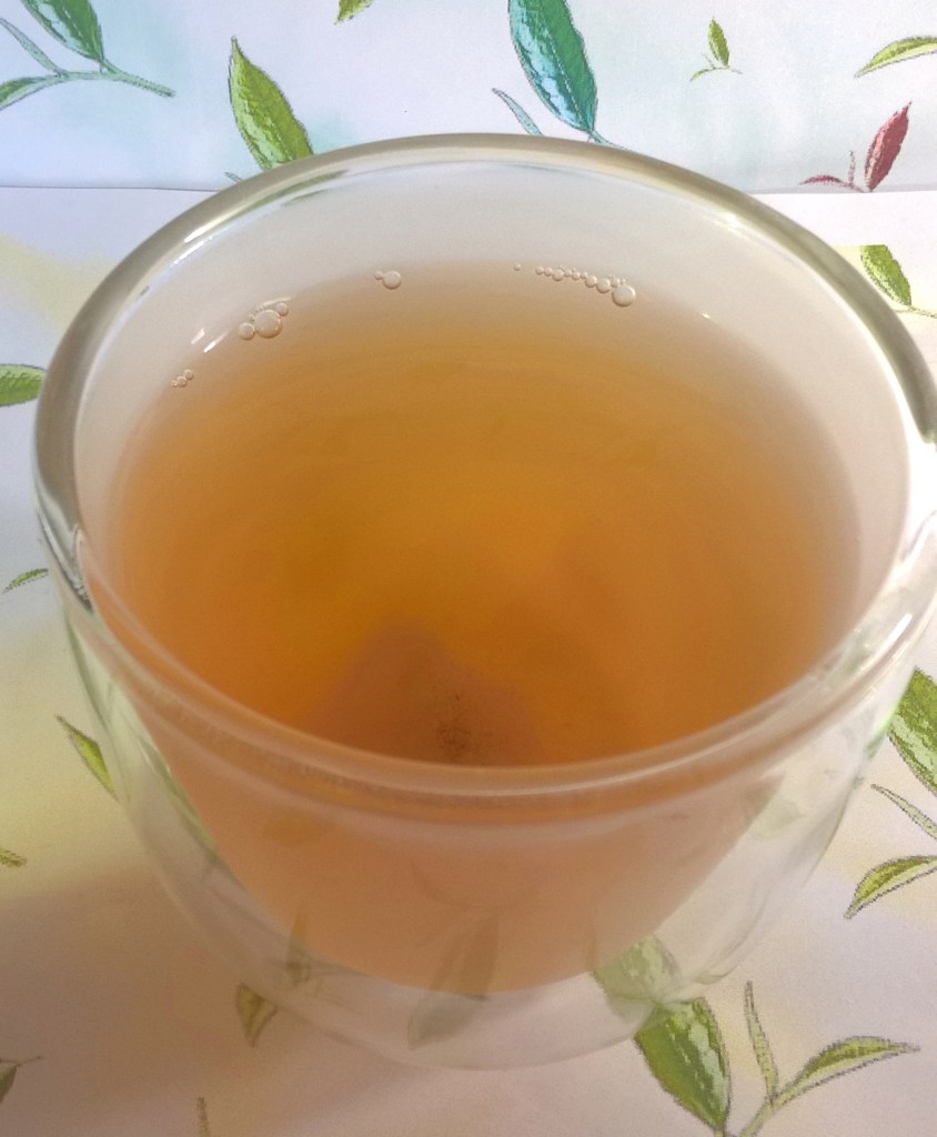 Tea liquor: After infusing, the scent coming off of the liquor was light, but had similar elements as the dry tea’s scent. The color of the liquor was a brownish-orange, sort of light honey-like, color.