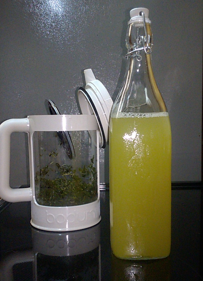 Hey there, tea drinkers! I decided to start experimenting with cold brewing some loose-leaf teas. I pulled the first of these experiments out of the fridge this morning and transferred the brew from my cold brew press to a glass bottle: an Uji Gyokuro tea. For this brew, I used roughly 50 g of dry leaf in about 1.5 L of spring water, and I let it cold brew in the fridge for about 11 hours. As you can see from the pictures, the result was a bright yellow-green nectar. It might be harder to tell from the images, but it is also very cloudy.