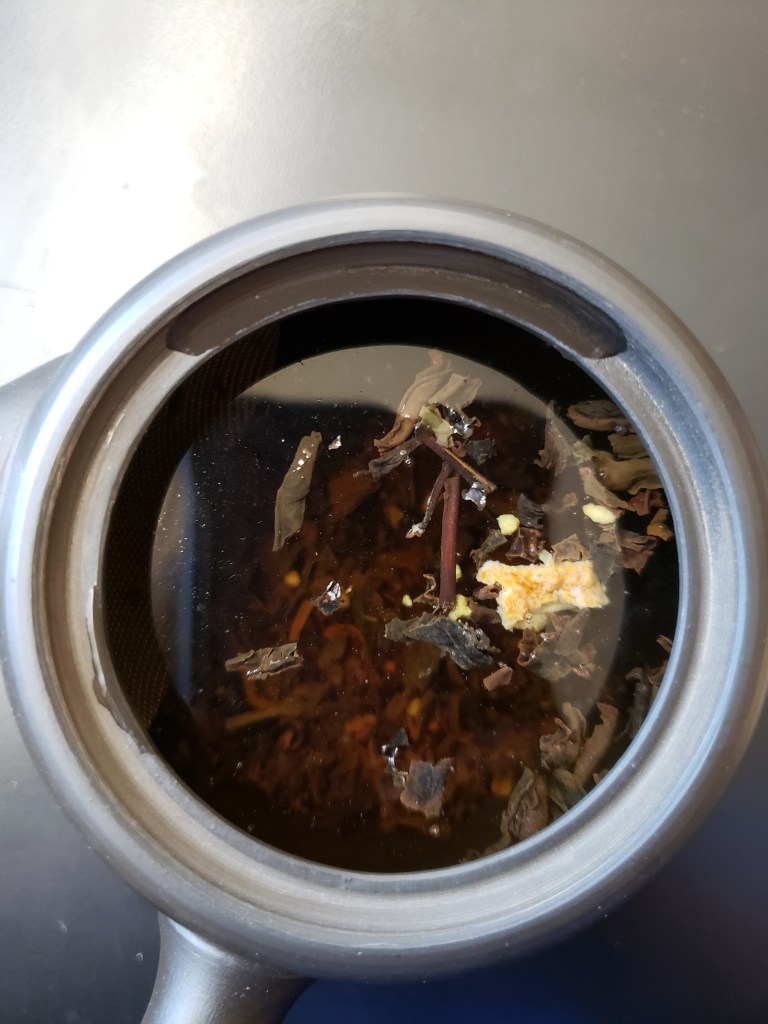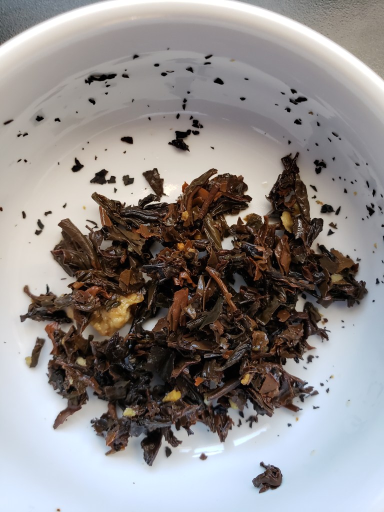 The tea liquor was warm and spicy, but also sweet. It had a very wintry spice feel to me. I didn’t get too much citrus flavor, which seemed to be light enough to blend into the spices. It had a thick mouthfeel and was a little astringent, leaving my mouth just a little dry in the finish.
